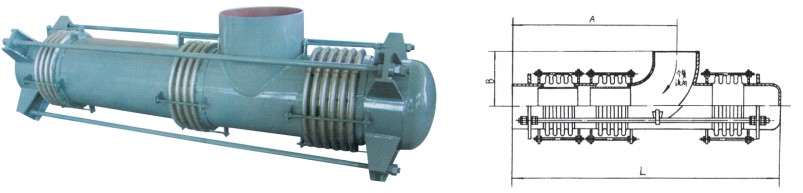 該膨脹節(jié)的兩端各有一個(gè)工作波紋管,中間有一個(gè)平衡波紋管,膨脹節(jié)通過(guò)受力構(gòu)件(大拉桿或舌管)來(lái)承受內(nèi)壓推力,因此管系只需中間固定支架。此類膨脹節(jié)只能吸收軸向位移。